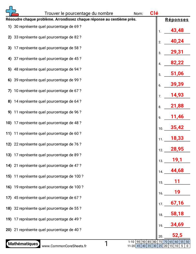 Fiches gratuites de math pour 6ème (6rp3c) sur Trouver le pourcentage du nombre. Chaque fiche contient 20 exercices avec corrigé et convient aux enseignants et à l'enseignement à domicile. Vous pouvez télécharger le PDF, créer des cartes mémoire ou l'utiliser pour l'apprentissage en ligne.