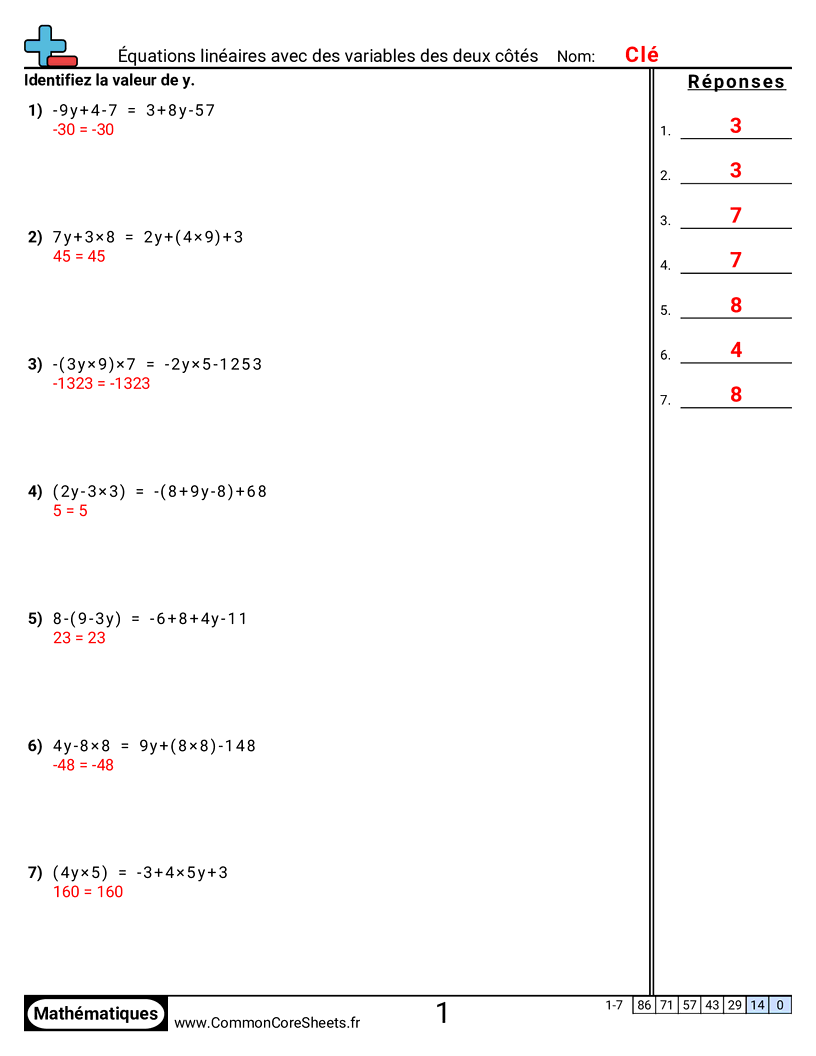 Fiches gratuites de math pour 4ème (8ee7b) sur Équations linéaires avec des variables des deux côtés. Chaque fiche contient 7 exercices avec corrigé et convient aux enseignants et à l'enseignement à domicile. Vous pouvez télécharger le PDF, créer des cartes mémoire ou l'utiliser pour l'apprentissage en ligne.