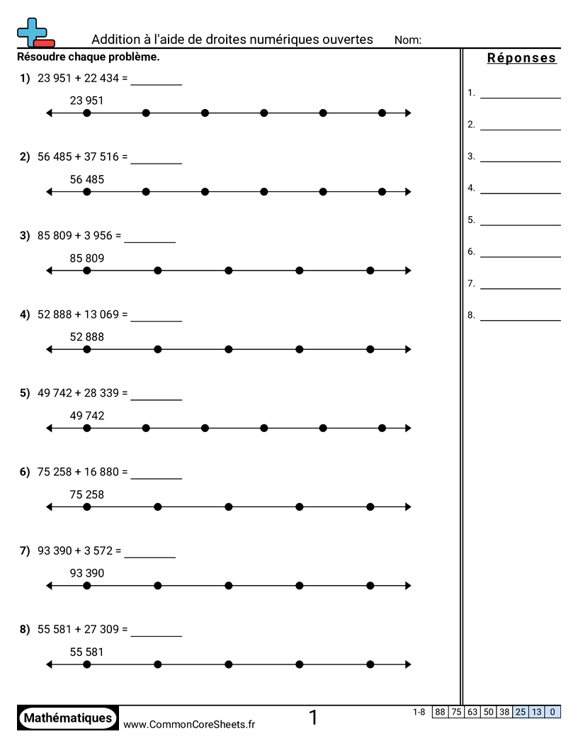 Fiches gratuites de math pour CM1 (4nbt4) sur Addition à l'aide de droites numériques ouvertes. Chaque fiche contient 8 exercices avec corrigé et convient aux enseignants et à l'enseignement à domicile. Vous pouvez télécharger le PDF, créer des cartes mémoire ou l'utiliser pour l'apprentissage en ligne.
