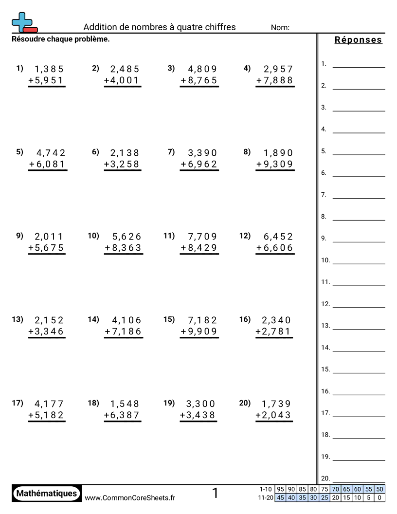 Chaque fiche d'exercices comporte 20 problèmes avec des additions de nombres entre 1000 et 9999.