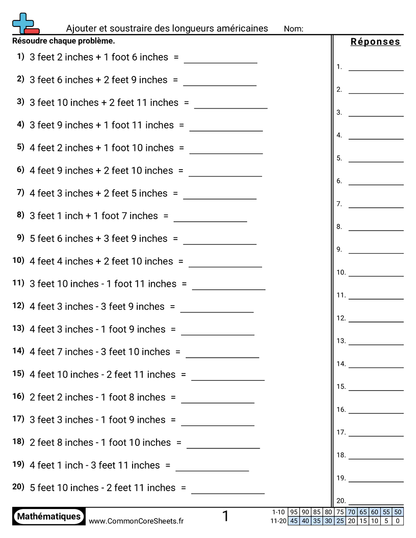 Fiches gratuites de math sur Ajouter et soustraire des longueurs américaines. Chaque fiche contient 20 exercices avec corrigé et convient aux enseignants et à l'enseignement à domicile. Vous pouvez télécharger le PDF, créer des cartes mémoire ou l'utiliser pour l'apprentissage en ligne.