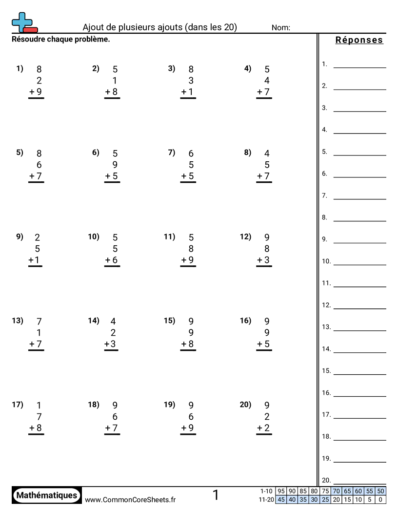 Fiches gratuites de math pour CP (1oa2) sur Ajout de plusieurs ajouts (dans les 20). Chaque fiche contient 20 exercices avec corrigé et convient aux enseignants et à l'enseignement à domicile. Vous pouvez télécharger le PDF, créer des cartes mémoire ou l'utiliser pour l'apprentissage en ligne.