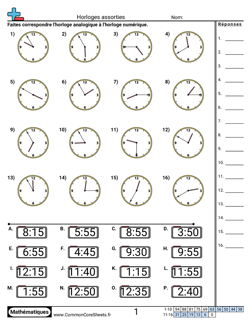 Fiches gratuites de math pour CE1 (2md7) sur Horloges assorties. Chaque fiche contient 16 exercices avec corrigé et convient aux enseignants et à l'enseignement à domicile. Vous pouvez télécharger le PDF, créer des cartes mémoire ou l'utiliser pour l'apprentissage en ligne.