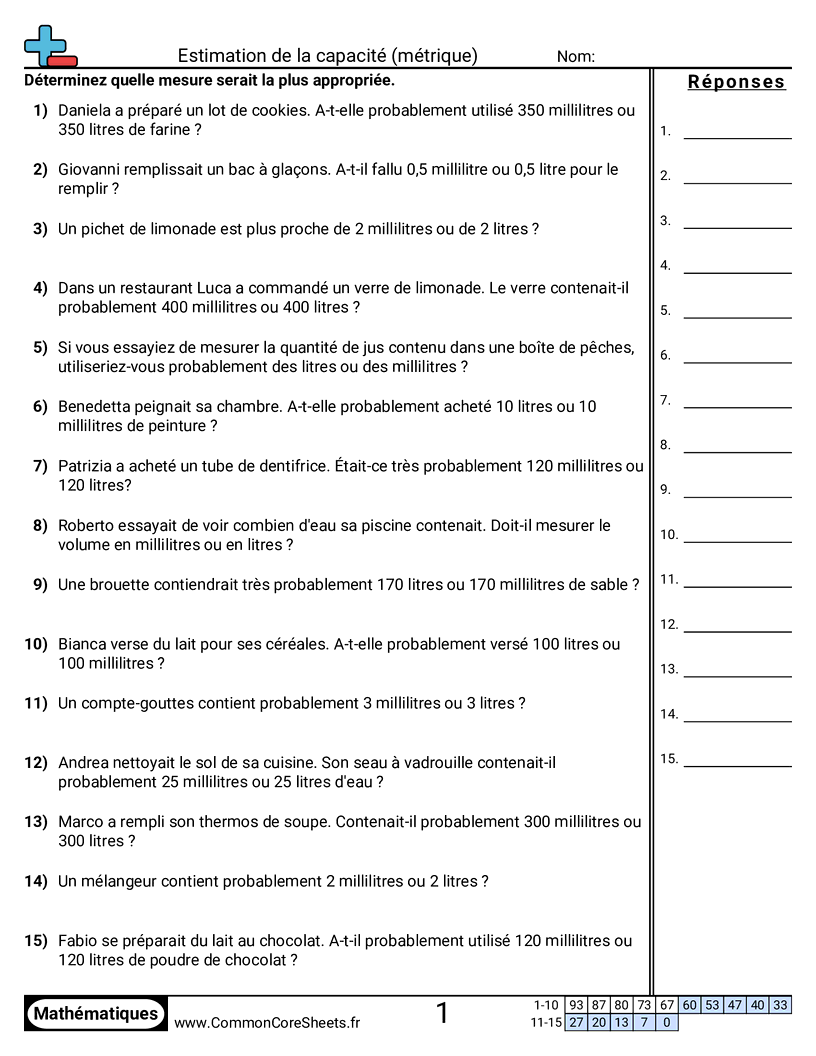 Fiches gratuites de math pour CE2 (3md2) sur Estimation de la capacité (métrique) . Chaque fiche contient 15 exercices avec corrigé et convient aux enseignants et à l'enseignement à domicile. Vous pouvez télécharger le PDF, créer des cartes mémoire ou l'utiliser pour l'apprentissage en ligne.