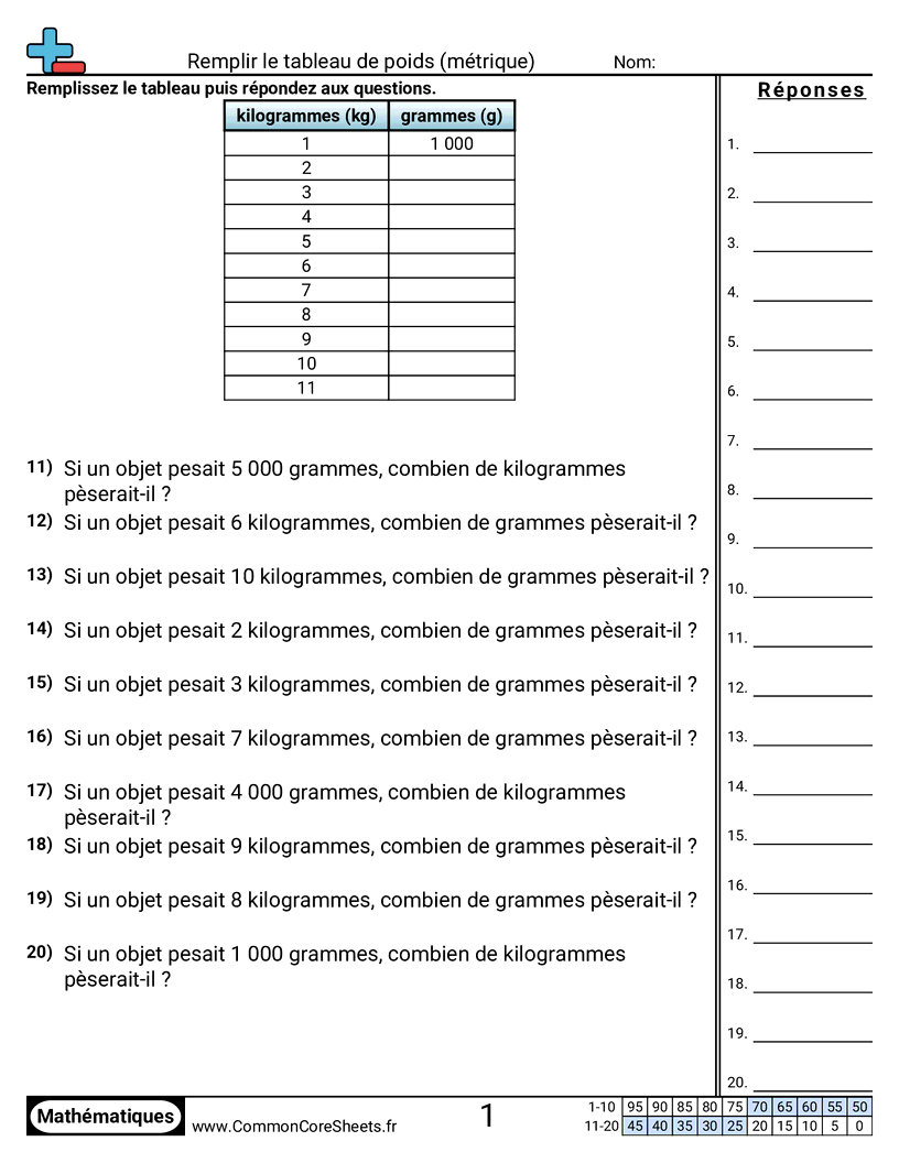 Fiches gratuites de math pour CM1 (4md1) sur Remplir le tableau de poids (métrique). Chaque fiche contient 20 exercices avec corrigé et convient aux enseignants et à l'enseignement à domicile. Vous pouvez télécharger le PDF, créer des cartes mémoire ou l'utiliser pour l'apprentissage en ligne.