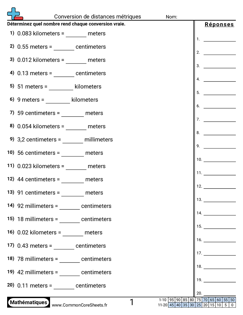 Fiches gratuites de math sur Conversion de distances métriques. Chaque fiche contient 20 exercices avec corrigé et convient aux enseignants et à l'enseignement à domicile. Vous pouvez télécharger le PDF, créer des cartes mémoire ou l'utiliser pour l'apprentissage en ligne.