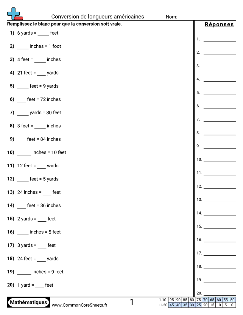 Fiches gratuites de math pour CM2 (5md1) sur Conversion de longueurs américaines . Chaque fiche contient 20 exercices avec corrigé et convient aux enseignants et à l'enseignement à domicile. Vous pouvez télécharger le PDF, créer des cartes mémoire ou l'utiliser pour l'apprentissage en ligne.