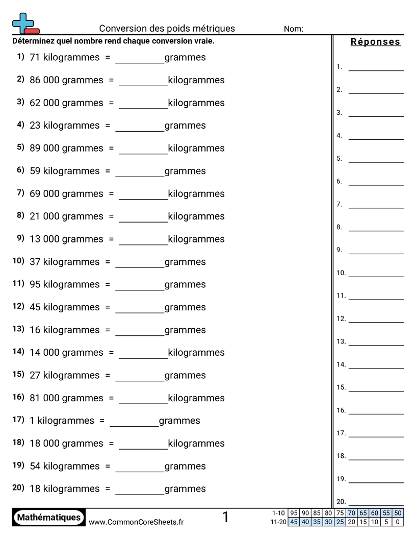 Fiches gratuites de math sur Conversion des poids métriques. Chaque fiche contient 20 exercices avec corrigé et convient aux enseignants et à l'enseignement à domicile. Vous pouvez télécharger le PDF, créer des cartes mémoire ou l'utiliser pour l'apprentissage en ligne.