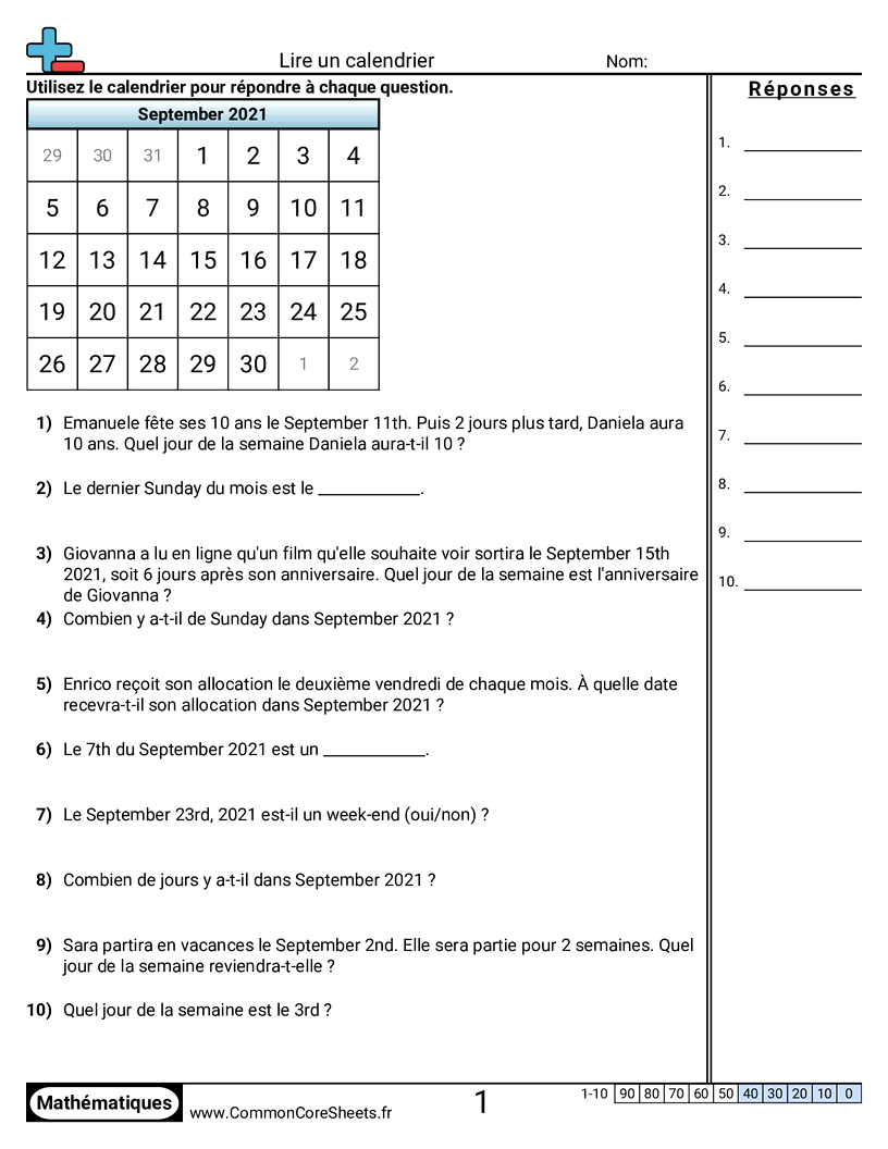Fiches gratuites de math sur Lire un calendrier. Chaque fiche contient 10 exercices avec corrigé et convient aux enseignants et à l'enseignement à domicile. Vous pouvez télécharger le PDF, créer des cartes mémoire ou l'utiliser pour l'apprentissage en ligne.
