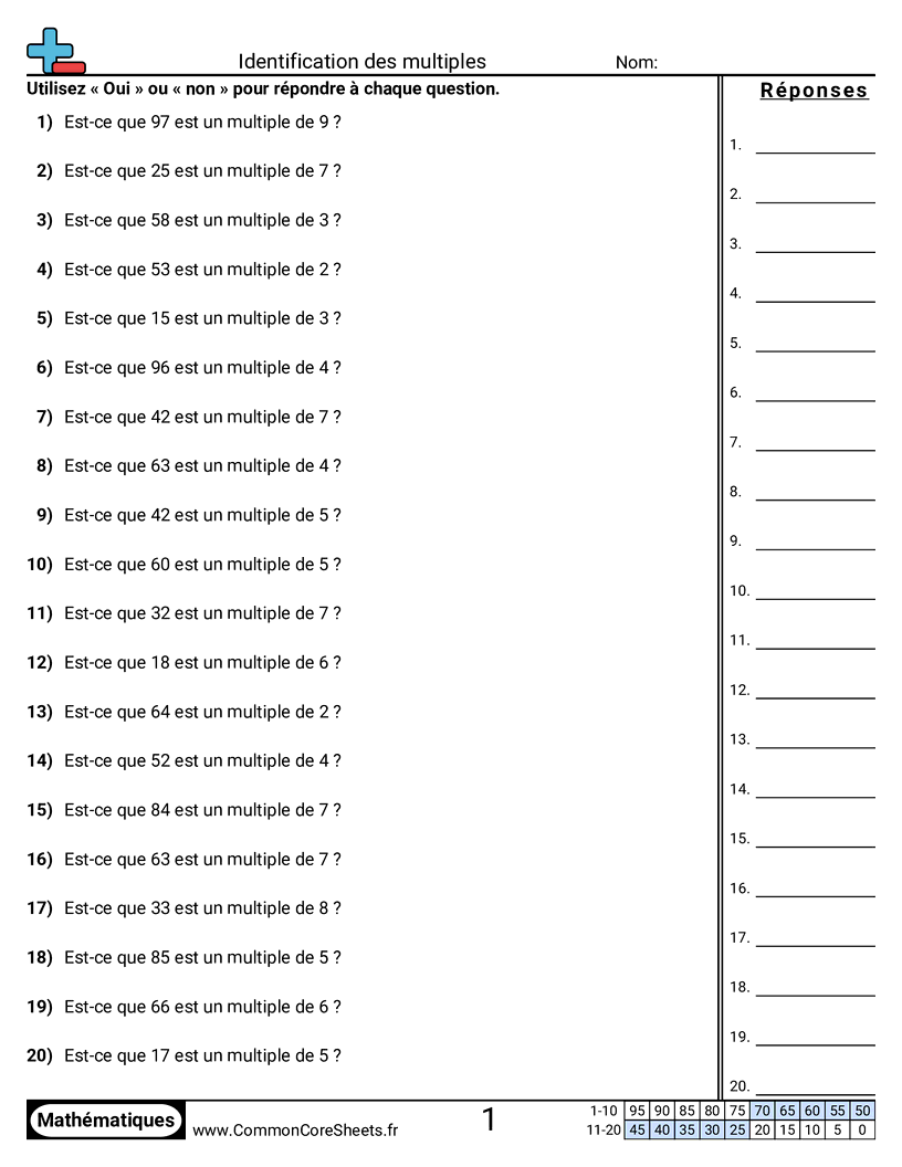 Fiches gratuites de math pour CM1 (4oa4) sur Identification des multiples . Chaque fiche contient 20 exercices avec corrigé et convient aux enseignants et à l'enseignement à domicile. Vous pouvez télécharger le PDF, créer des cartes mémoire ou l'utiliser pour l'apprentissage en ligne.