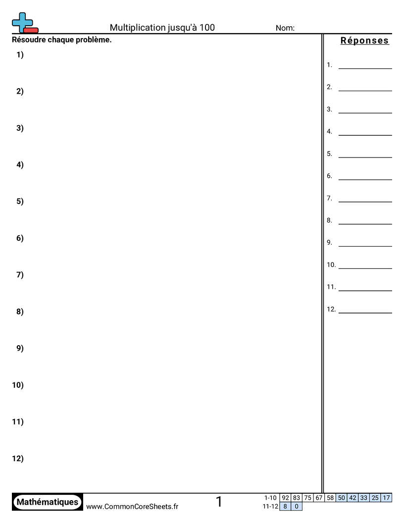 Fiches gratuites de math pour CM1 (4oa2) sur Multiplication jusqu'à 100. Chaque fiche contient 12 exercices avec corrigé et convient aux enseignants et à l'enseignement à domicile. Vous pouvez télécharger le PDF, créer des cartes mémoire ou l'utiliser pour l'apprentissage en ligne.