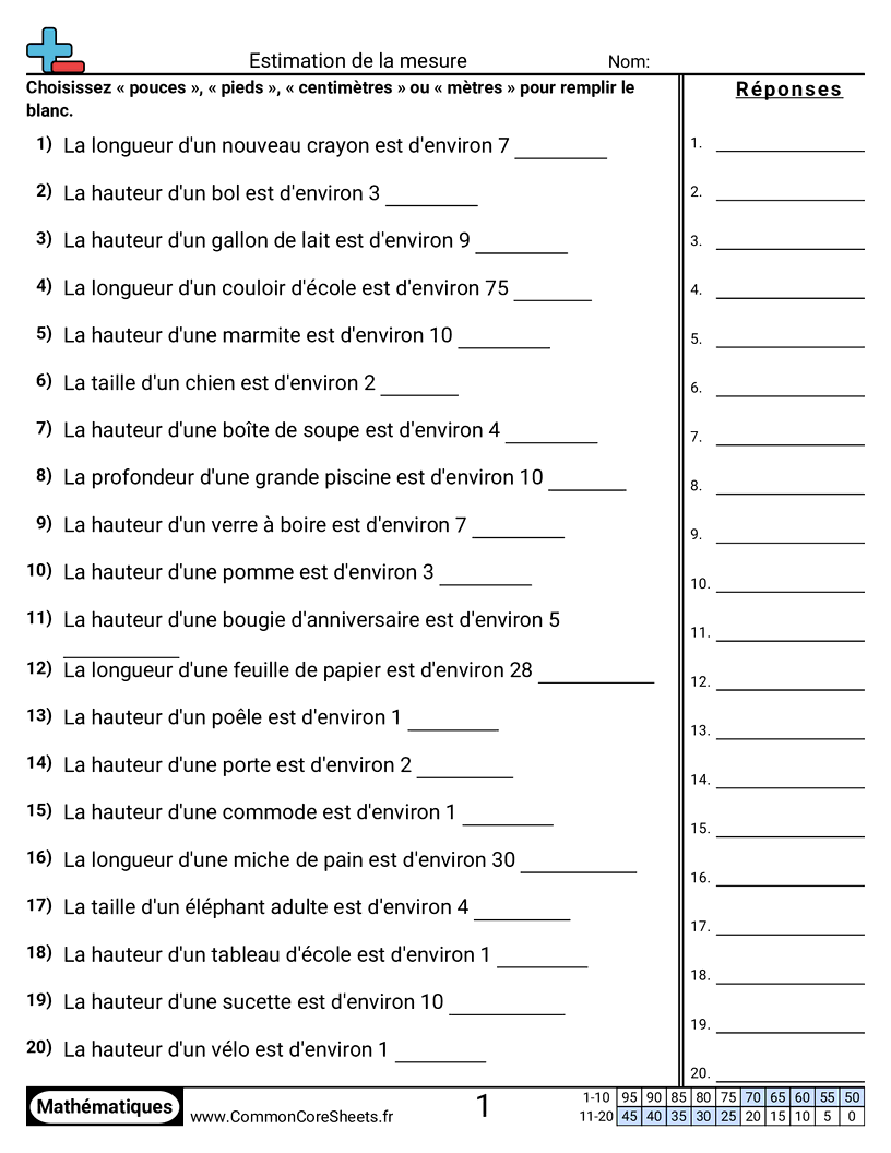 Fiches gratuites de math pour CE1 (2md3) sur Estimation de la mesure . Chaque fiche contient 20 exercices avec corrigé et convient aux enseignants et à l'enseignement à domicile. Vous pouvez télécharger le PDF, créer des cartes mémoire ou l'utiliser pour l'apprentissage en ligne.