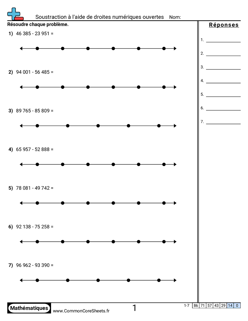 Fiches gratuites de math pour CM1 (4nbt4) sur Soustraction à l'aide de droites numériques ouvertes. Chaque fiche contient 7 exercices avec corrigé et convient aux enseignants et à l'enseignement à domicile. Vous pouvez télécharger le PDF, créer des cartes mémoire ou l'utiliser pour l'apprentissage en ligne.