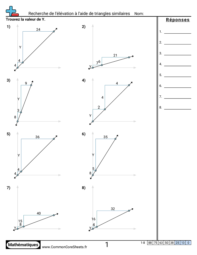 Fiches gratuites de math pour 4ème (8ee6) sur Recherche de l'élévation à l'aide de triangles similaires. Chaque fiche contient 8 exercices avec corrigé et convient aux enseignants et à l'enseignement à domicile. Vous pouvez télécharger le PDF, créer des cartes mémoire ou l'utiliser pour l'apprentissage en ligne.