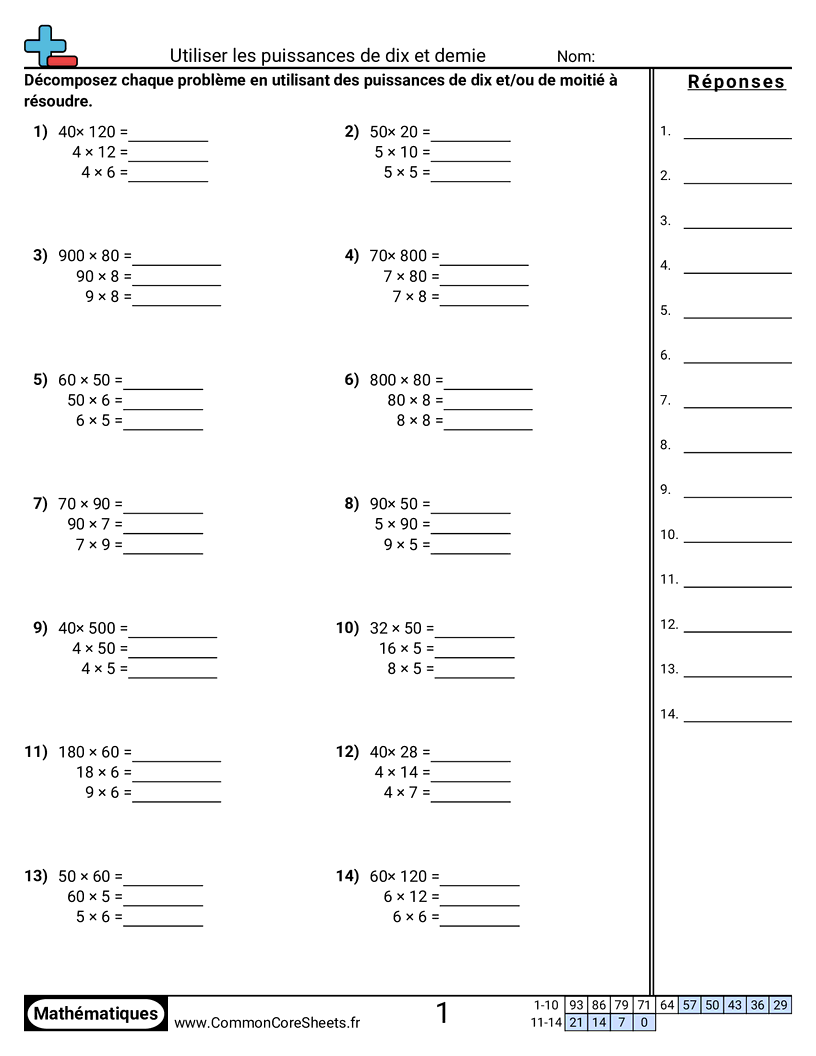 Fiches gratuites de math sur Utiliser les puissances de dix et demie. Chaque fiche contient 14 exercices avec corrigé et convient aux enseignants et à l'enseignement à domicile. Vous pouvez télécharger le PDF, créer des cartes mémoire ou l'utiliser pour l'apprentissage en ligne.