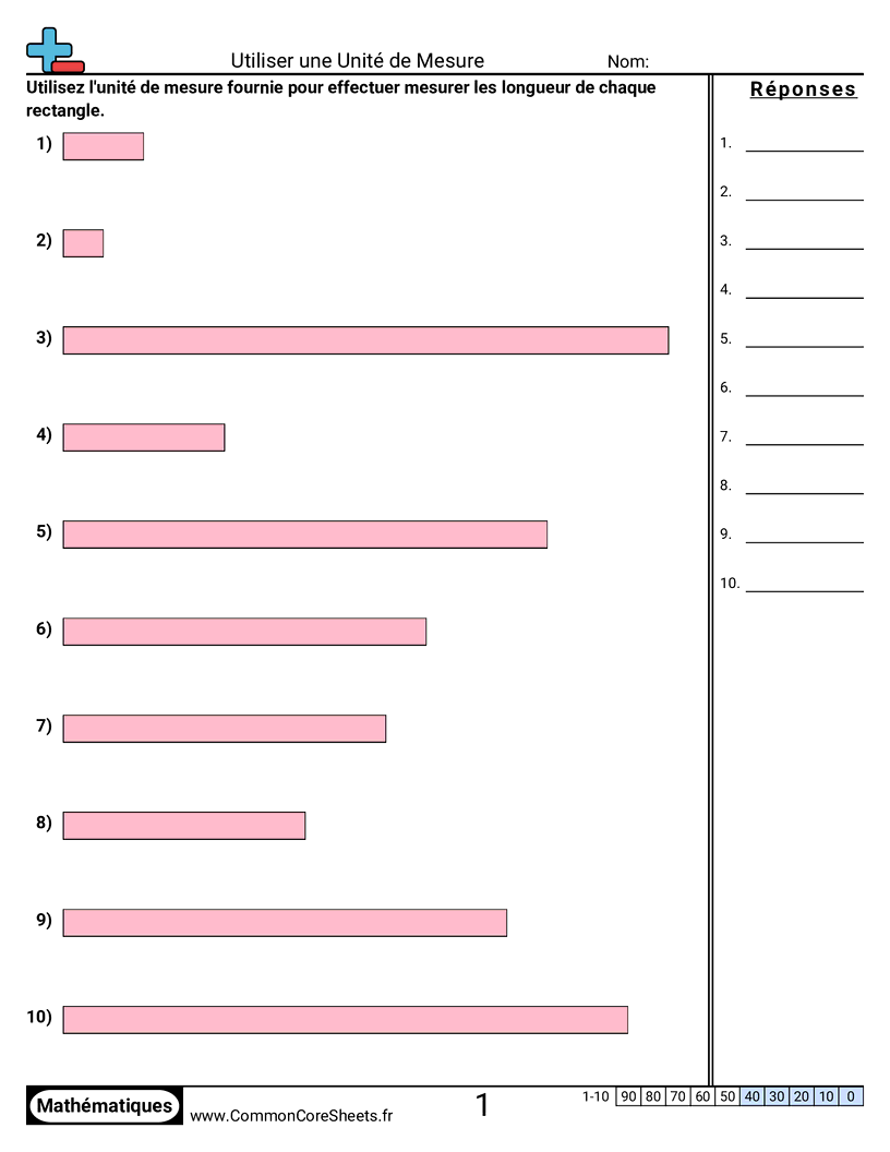 Fiches gratuites de math pour CP (1md2) sur Utiliser une Unité de Mesure. Chaque fiche contient 10 exercices avec corrigé et convient aux enseignants et à l'enseignement à domicile. Vous pouvez télécharger le PDF, créer des cartes mémoire ou l'utiliser pour l'apprentissage en ligne.