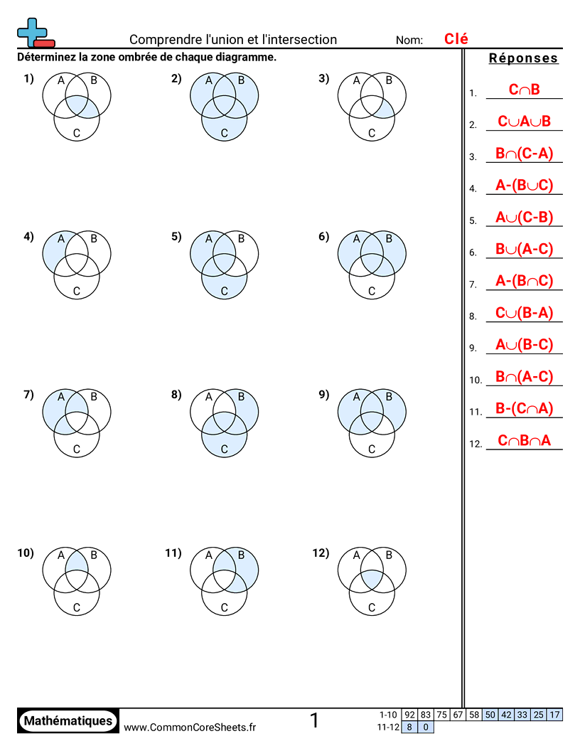 Fiches gratuites de math sur Comprendre l'union et l'intersection. Chaque fiche contient 12 exercices avec corrigé et convient aux enseignants et à l'enseignement à domicile. Vous pouvez télécharger le PDF, créer des cartes mémoire ou l'utiliser pour l'apprentissage en ligne.
