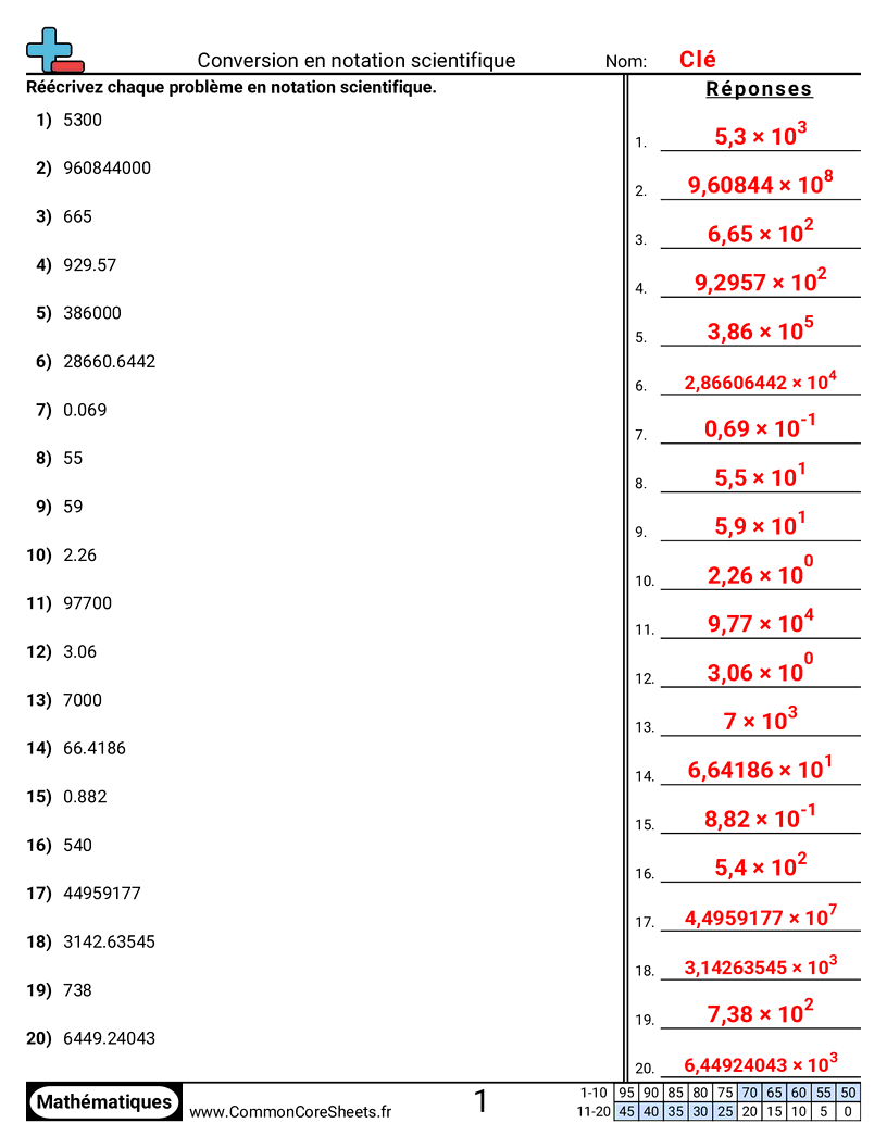 Fiches gratuites de math pour 4ème (8ee4) sur Conversion en notation scientifique. Chaque fiche contient 20 exercices avec corrigé et convient aux enseignants et à l'enseignement à domicile. Vous pouvez télécharger le PDF, créer des cartes mémoire ou l'utiliser pour l'apprentissage en ligne.