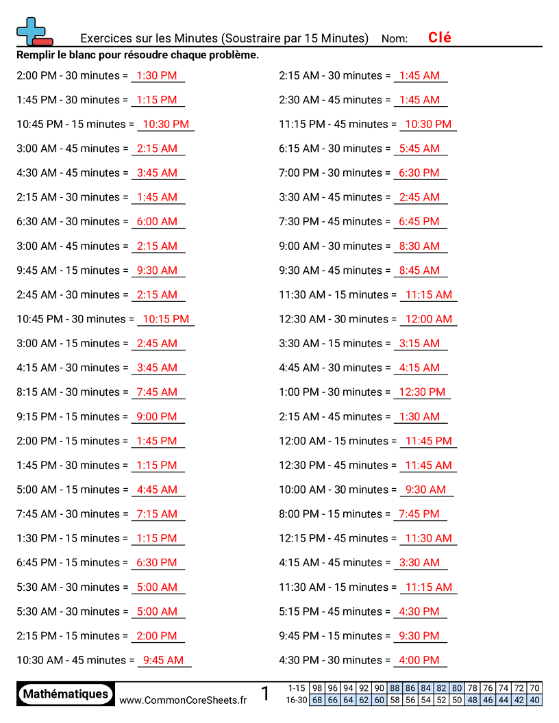 Fiches gratuites de math sur Exercices sur les Minutes (Soustraire par 15 Minutes). Chaque fiche contient 50 exercices avec corrigé et convient aux enseignants et à l'enseignement à domicile. Vous pouvez télécharger le PDF, créer des cartes mémoire ou l'utiliser pour l'apprentissage en ligne.