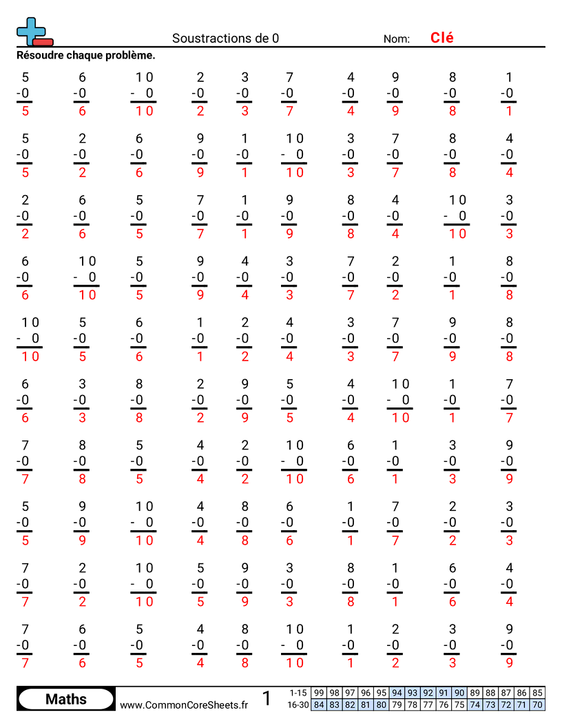 Fiches gratuites de math sur Soustractions de 0. Chaque fiche contient 100 exercices avec corrigé et convient aux enseignants et à l'enseignement à domicile. Vous pouvez télécharger le PDF, créer des cartes mémoire ou l'utiliser pour l'apprentissage en ligne.