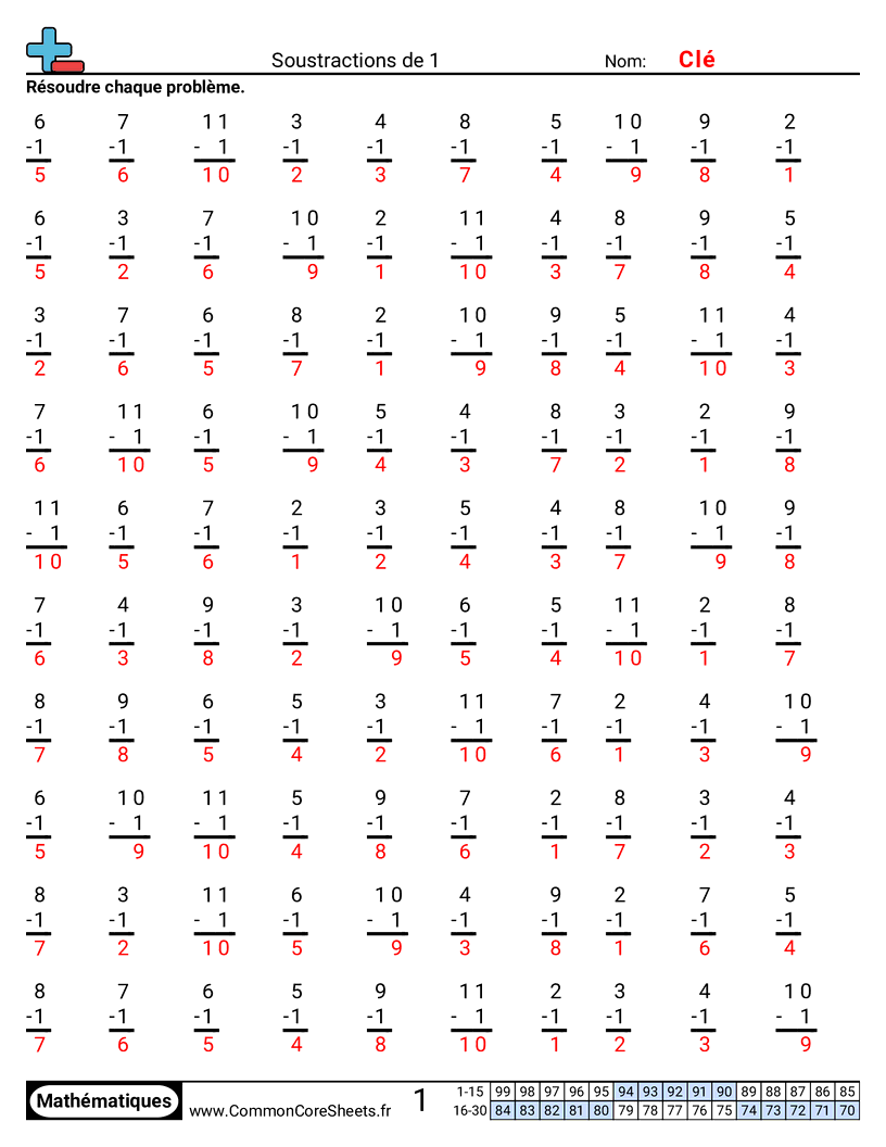 Fiches gratuites de math sur Soustractions de 1. Chaque fiche contient 100 exercices avec corrigé et convient aux enseignants et à l'enseignement à domicile. Vous pouvez télécharger le PDF, créer des cartes mémoire ou l'utiliser pour l'apprentissage en ligne.