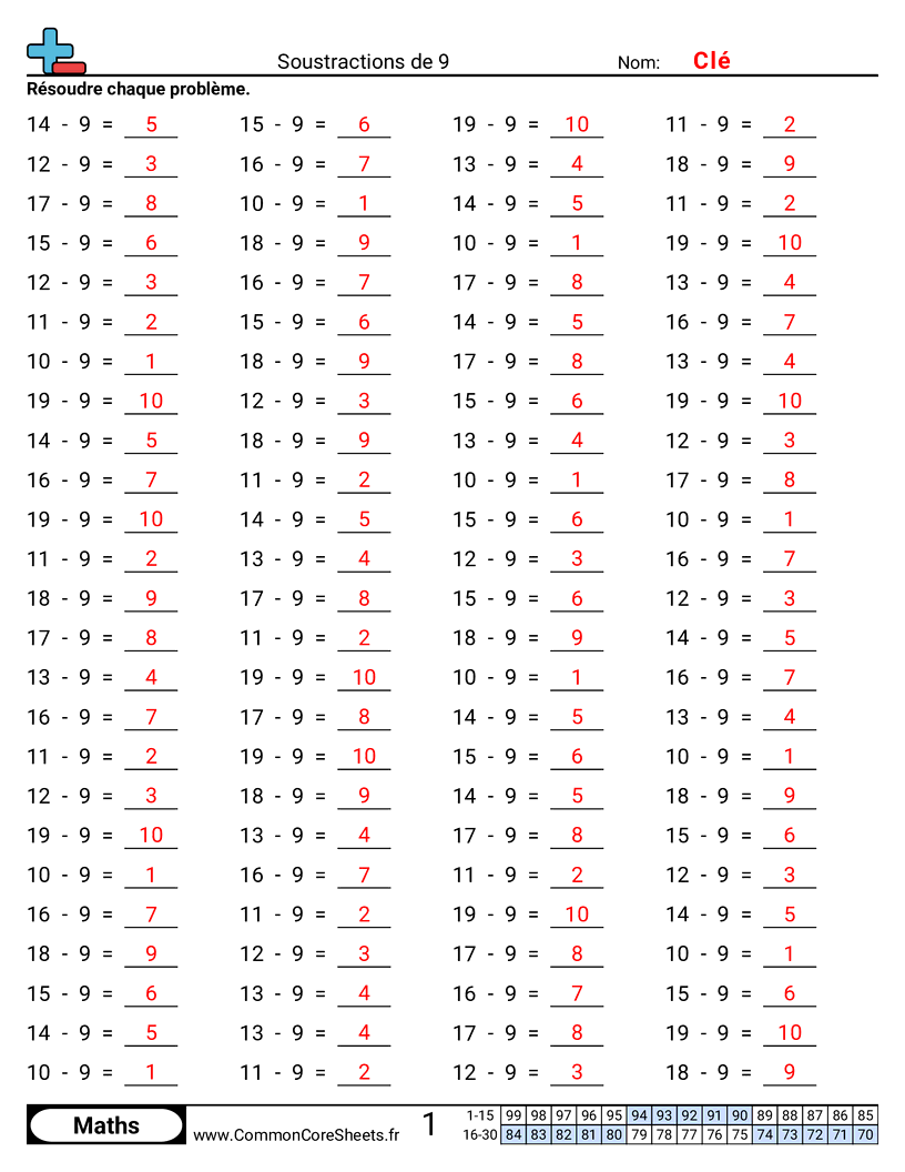 Fiches gratuites de math sur Soustractions de 9. Chaque fiche contient 100 exercices avec corrigé et convient aux enseignants et à l'enseignement à domicile. Vous pouvez télécharger le PDF, créer des cartes mémoire ou l'utiliser pour l'apprentissage en ligne.