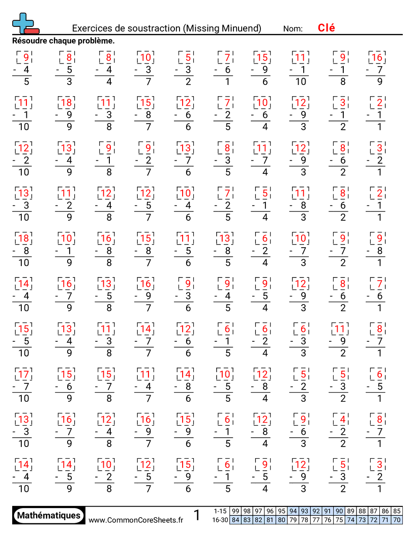 Fiches gratuites de math sur Exercices de soustraction (Missing Minuend). Chaque fiche contient 100 exercices avec corrigé et convient aux enseignants et à l'enseignement à domicile. Vous pouvez télécharger le PDF, créer des cartes mémoire ou l'utiliser pour l'apprentissage en ligne.