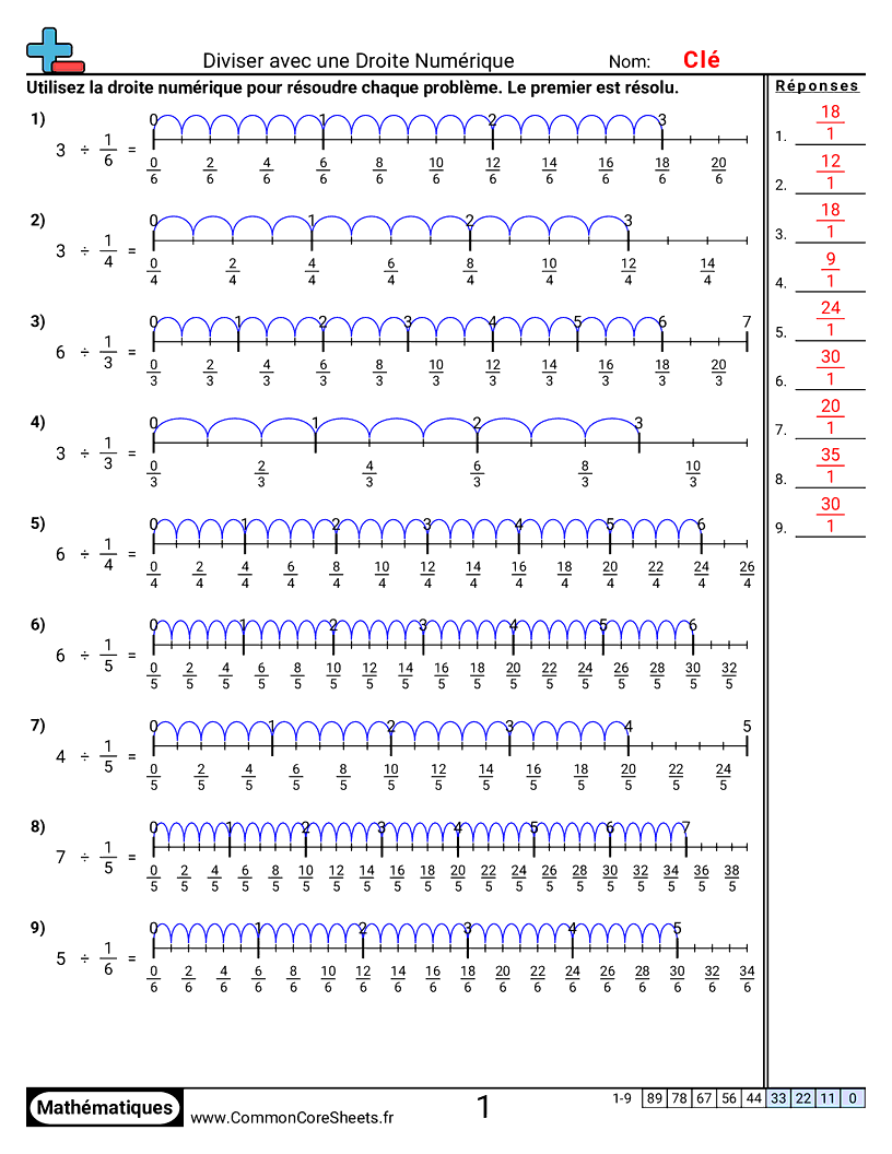 Chaque fiche comporte 9 exercices de division d'un nombre entier par une fraction unitaire avec une droite numérique.