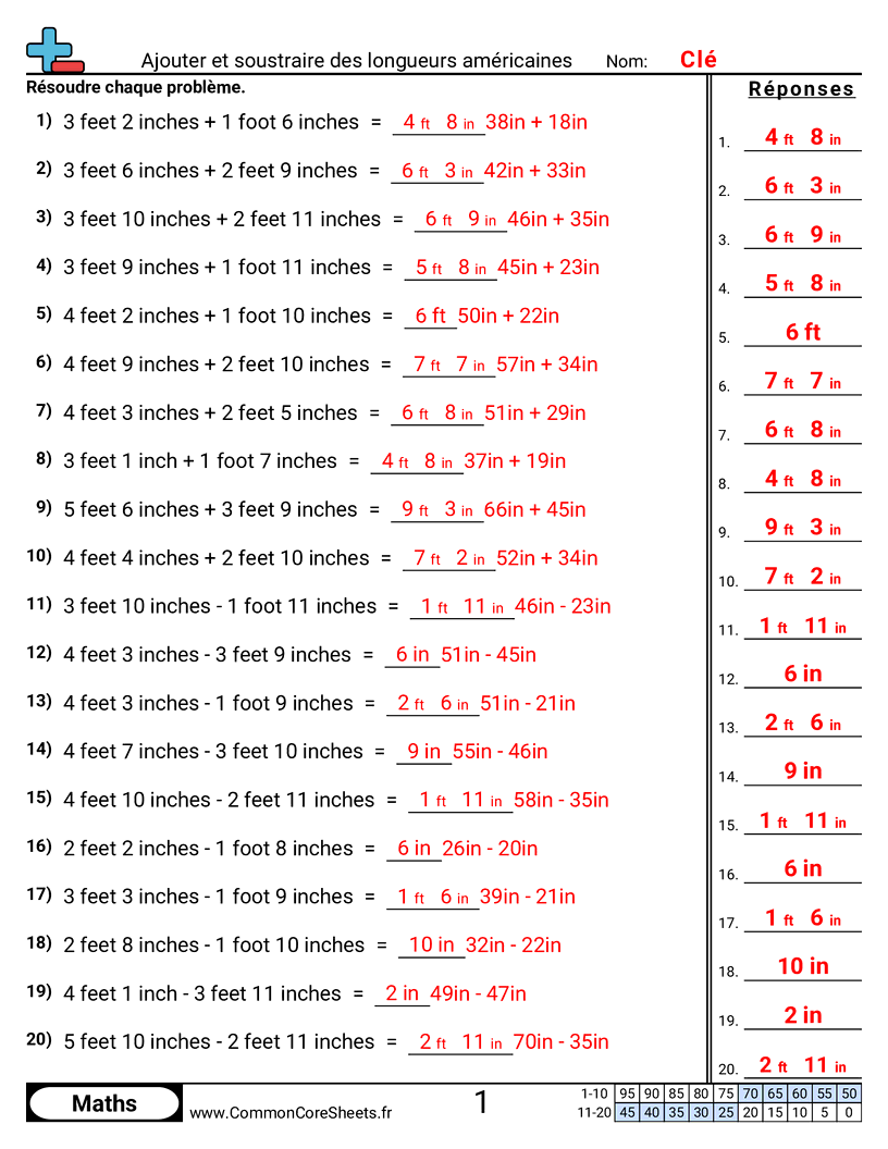 Fiches gratuites de math sur Ajouter et soustraire des longueurs américaines. Chaque fiche contient 20 exercices avec corrigé et convient aux enseignants et à l'enseignement à domicile. Vous pouvez télécharger le PDF, créer des cartes mémoire ou l'utiliser pour l'apprentissage en ligne.