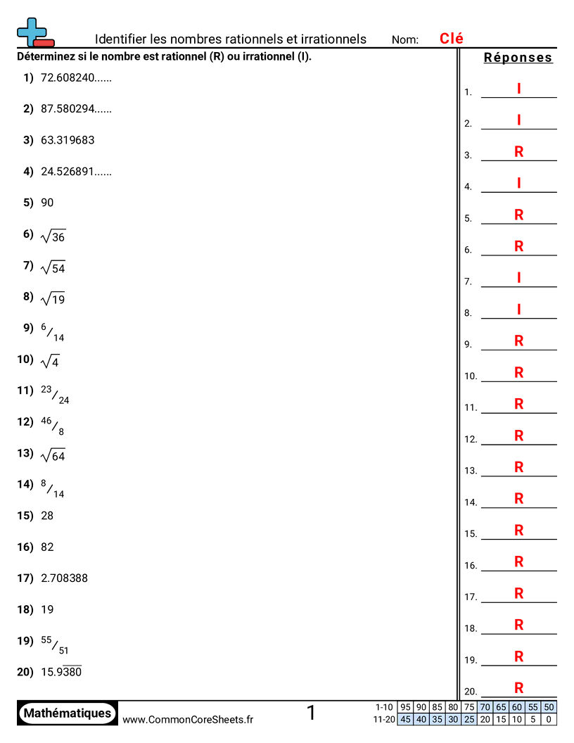 Fiches gratuites de math pour 4ème (8ns1) sur Identifier les nombres rationnels et irrationnels. Chaque fiche contient 20 exercices avec corrigé et convient aux enseignants et à l'enseignement à domicile. Vous pouvez télécharger le PDF, créer des cartes mémoire ou l'utiliser pour l'apprentissage en ligne.