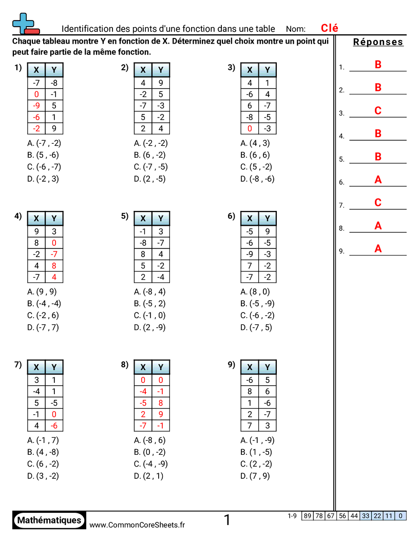 Fiches gratuites de math pour 4ème (8f1) sur Identification des points d'une fonction dans une table. Chaque fiche contient 9 exercices avec corrigé et convient aux enseignants et à l'enseignement à domicile. Vous pouvez télécharger le PDF, créer des cartes mémoire ou l'utiliser pour l'apprentissage en ligne.