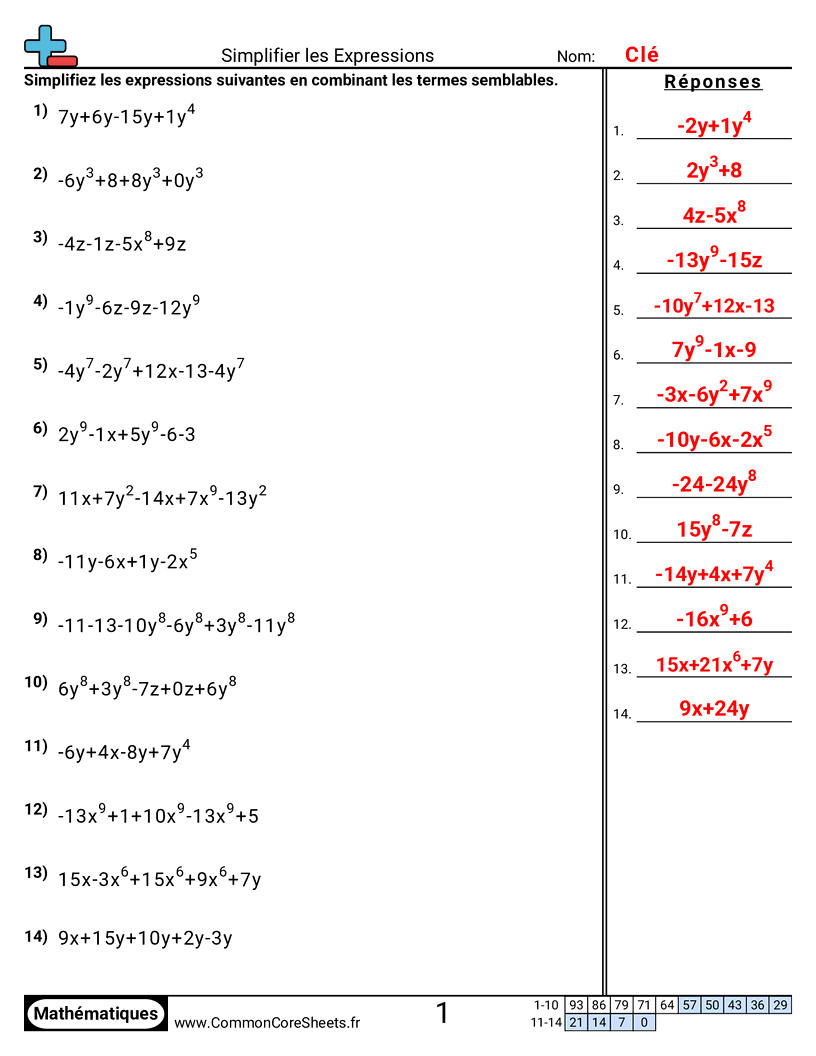 Fiches gratuites de math sur Simplifier les Expressions. Chaque fiche contient 14 exercices avec corrigé et convient aux enseignants et à l'enseignement à domicile. Vous pouvez télécharger le PDF, créer des cartes mémoire ou l'utiliser pour l'apprentissage en ligne.