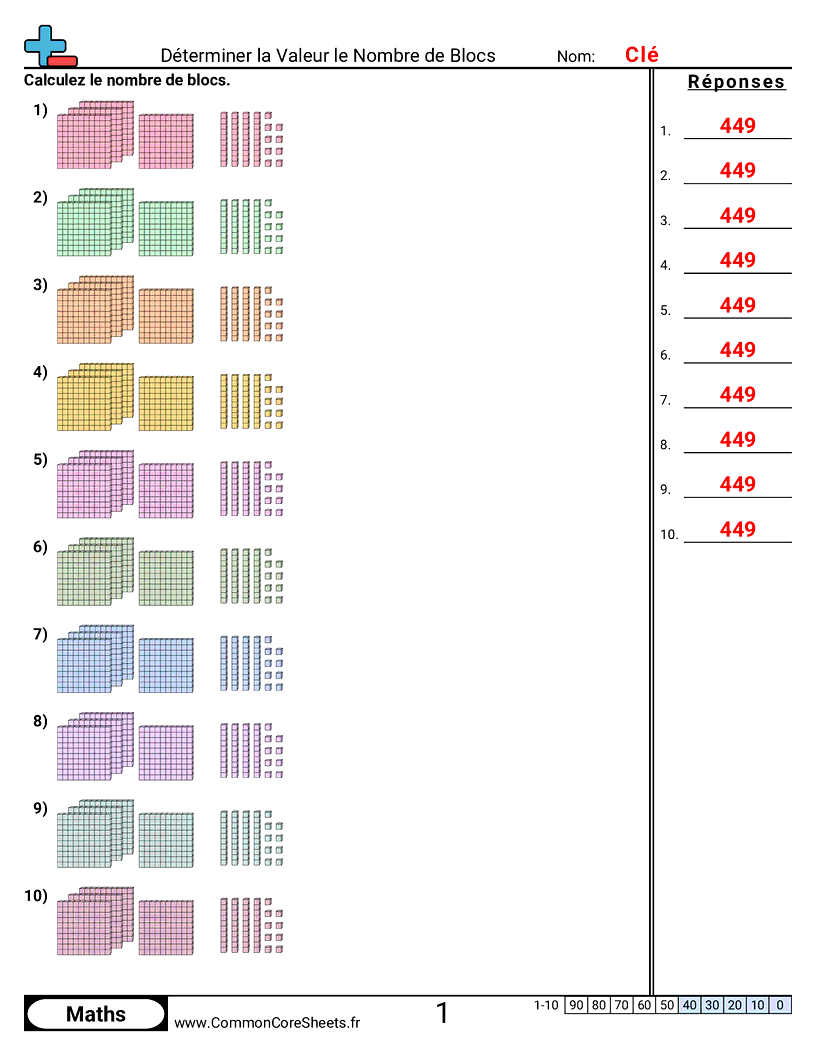 Fiches gratuites de math sur Déterminer la Valeur le Nombre de Blocs. Chaque fiche contient 10 exercices avec corrigé et convient aux enseignants et à l'enseignement à domicile. Vous pouvez télécharger le PDF, créer des cartes mémoire ou l'utiliser pour l'apprentissage en ligne.