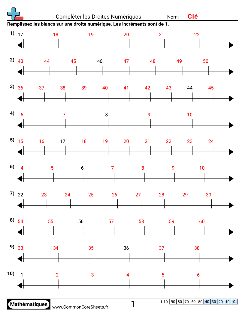 Fiches gratuites de math pour CE1 (2md6) sur Compléter les Droites Numériques. Chaque fiche contient 10 exercices avec corrigé et convient aux enseignants et à l'enseignement à domicile. Vous pouvez télécharger le PDF, créer des cartes mémoire ou l'utiliser pour l'apprentissage en ligne.