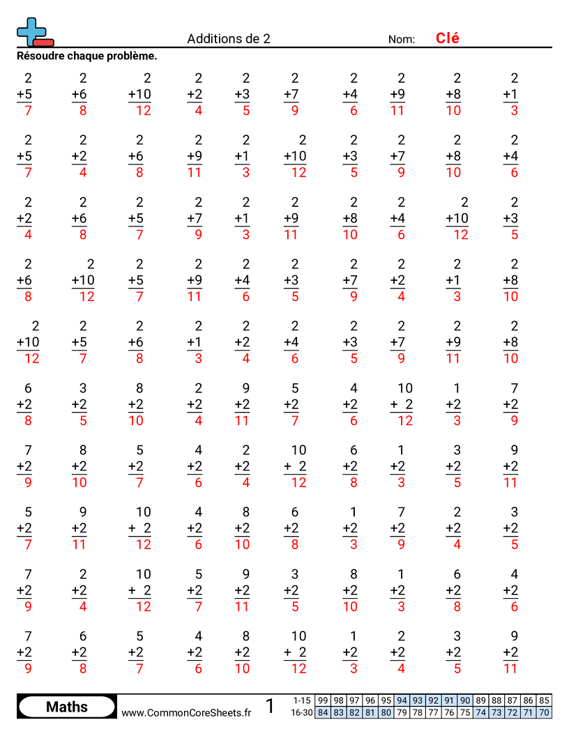 Fiches gratuites de math sur Additions de 2. Chaque fiche contient 100 exercices avec corrigé et convient aux enseignants et à l'enseignement à domicile. Vous pouvez télécharger le PDF, créer des cartes mémoire ou l'utiliser pour l'apprentissage en ligne.
