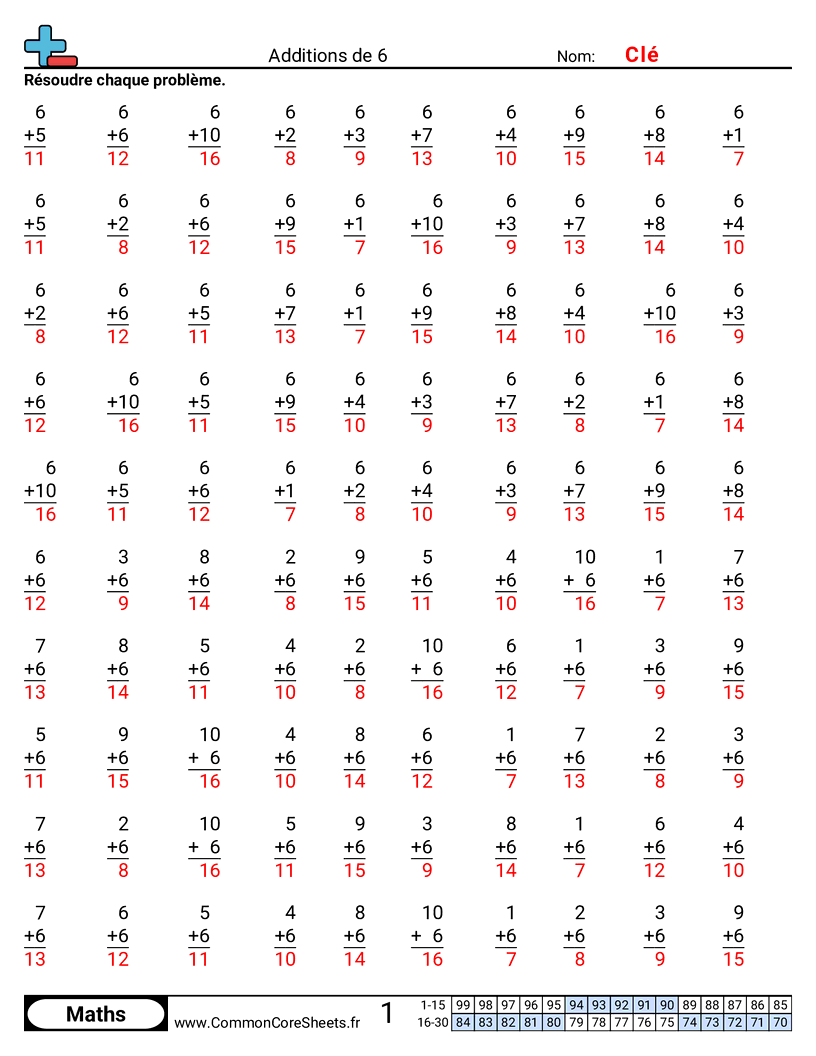 Chaque fiche comporte 100 exercices d'additions de 6+1 à 6+10.