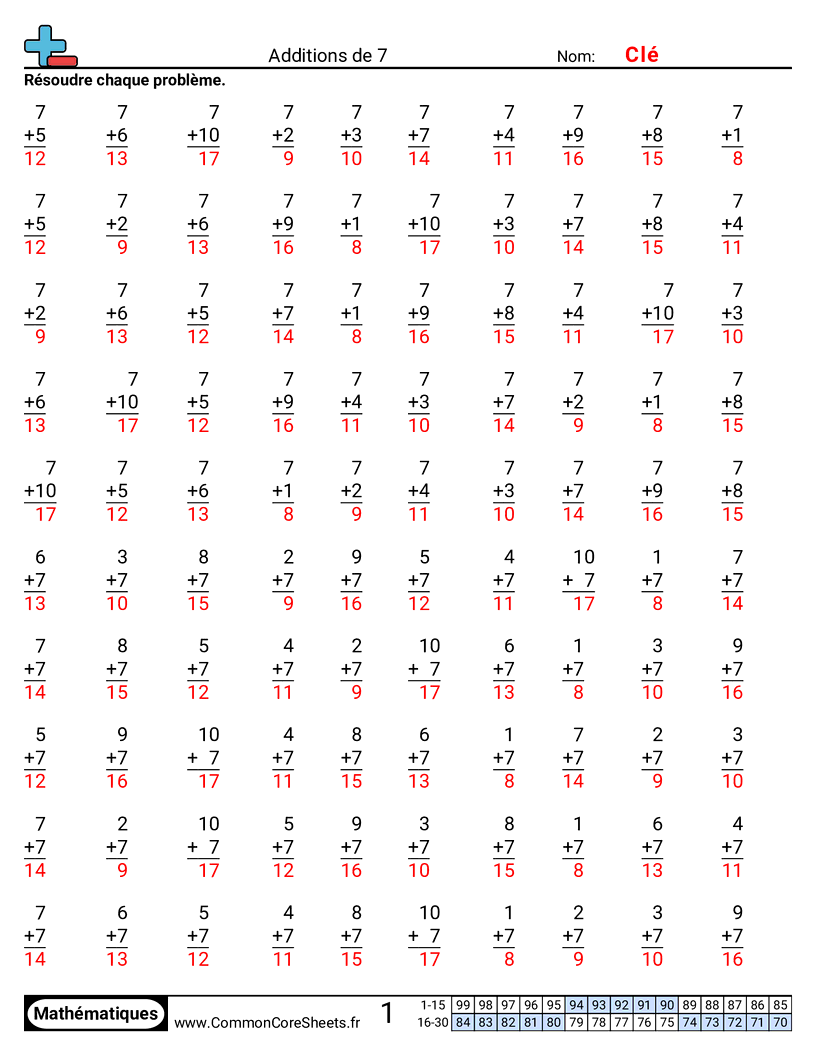 Fiches gratuites de math sur Additions de 7. Chaque fiche contient 100 exercices avec corrigé et convient aux enseignants et à l'enseignement à domicile. Vous pouvez télécharger le PDF, créer des cartes mémoire ou l'utiliser pour l'apprentissage en ligne.