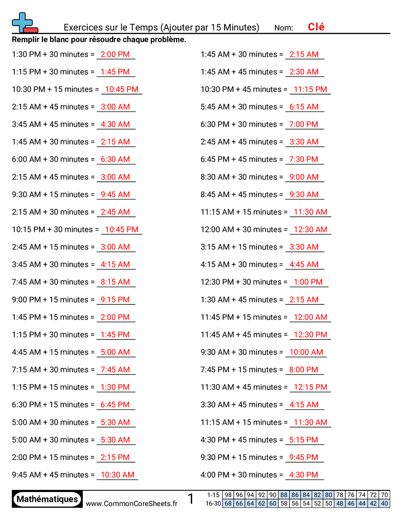 Fiches gratuites de math sur Exercices sur le Temps (Ajouter par 15 Minutes). Chaque fiche contient 50 exercices avec corrigé et convient aux enseignants et à l'enseignement à domicile. Vous pouvez télécharger le PDF, créer des cartes mémoire ou l'utiliser pour l'apprentissage en ligne.