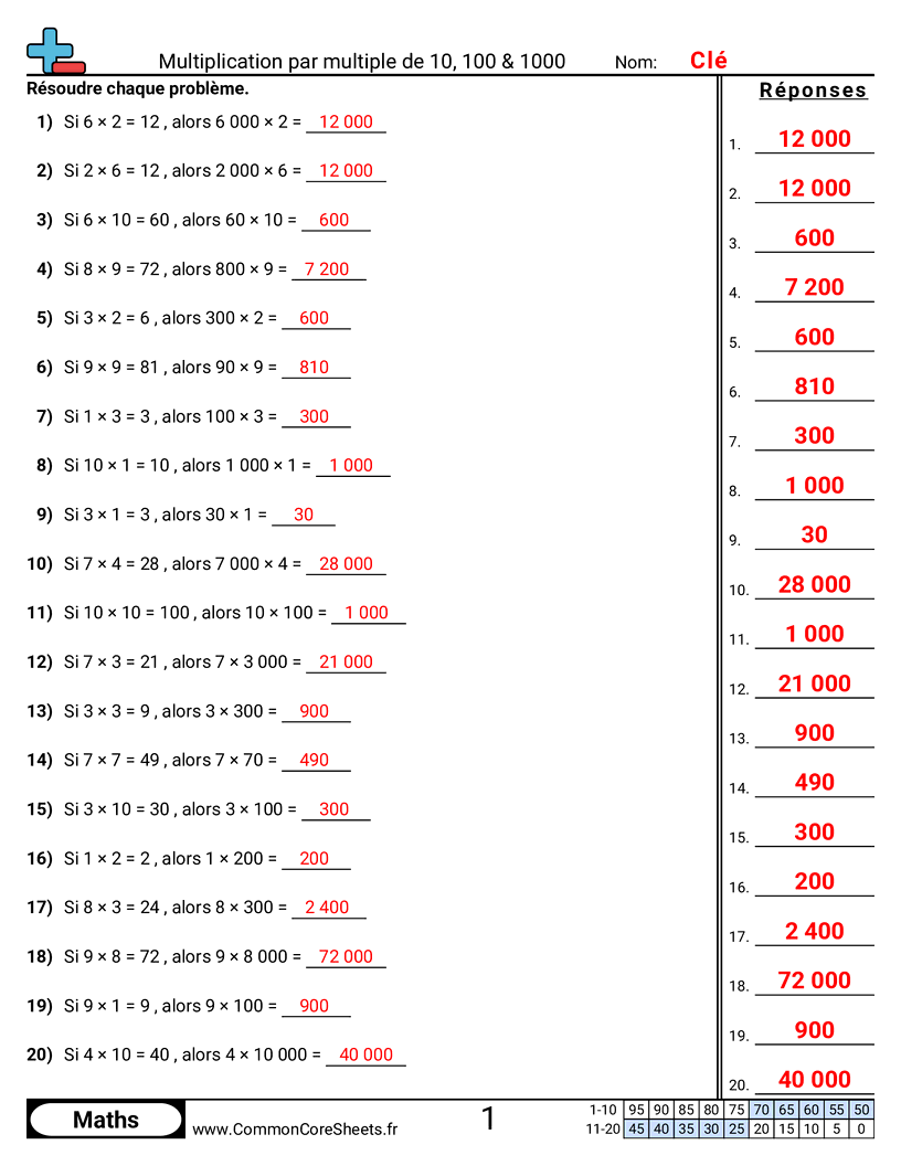 Fiches gratuites de math pour CM2 (5nbt2) sur Multiplication par multiple de 10, 100 & 1000. Chaque fiche contient 20 exercices avec corrigé et convient aux enseignants et à l'enseignement à domicile. Vous pouvez télécharger le PDF, créer des cartes mémoire ou l'utiliser pour l'apprentissage en ligne.
