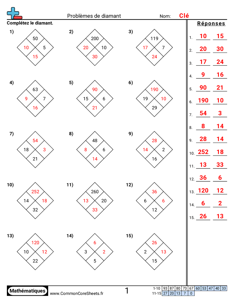 Fiches gratuites de math sur Problèmes de diamant. Chaque fiche contient 15 exercices avec corrigé et convient aux enseignants et à l'enseignement à domicile. Vous pouvez télécharger le PDF, créer des cartes mémoire ou l'utiliser pour l'apprentissage en ligne.