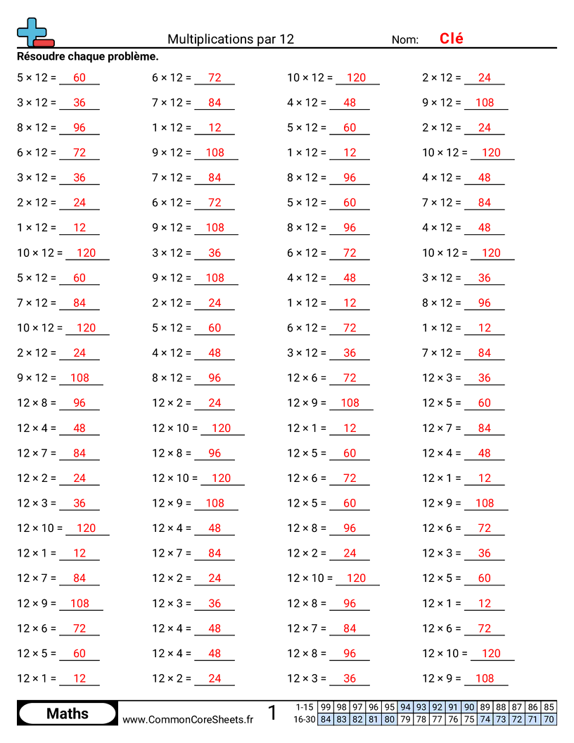 Fiches gratuites de math sur Multiplications par 12. Chaque fiche contient 100 exercices avec corrigé et convient aux enseignants et à l'enseignement à domicile. Vous pouvez télécharger le PDF, créer des cartes mémoire ou l'utiliser pour l'apprentissage en ligne.