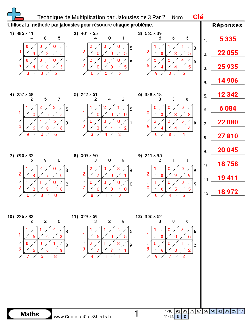 Fiches gratuites de math pour CM2 (5nbt5) sur Technique de Multiplication par Jalousies de 3 Par 2 . Chaque fiche contient 12 exercices avec corrigé et convient aux enseignants et à l'enseignement à domicile. Vous pouvez télécharger le PDF, créer des cartes mémoire ou l'utiliser pour l'apprentissage en ligne.