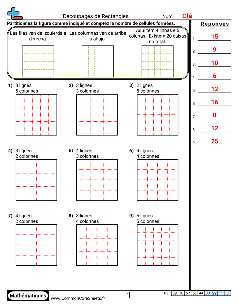 Chaque fiche comporte 9 exercices de partition d'un rectangle afin de trouver le nombre de cellules ainsi formées.