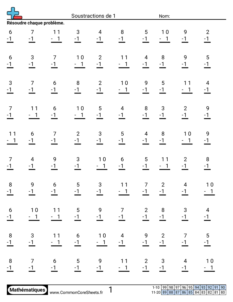 Fiches gratuites de math sur Soustractions de 1. Chaque fiche contient 100 exercices avec corrigé et convient aux enseignants et à l'enseignement à domicile. Vous pouvez télécharger le PDF, créer des cartes mémoire ou l'utiliser pour l'apprentissage en ligne.