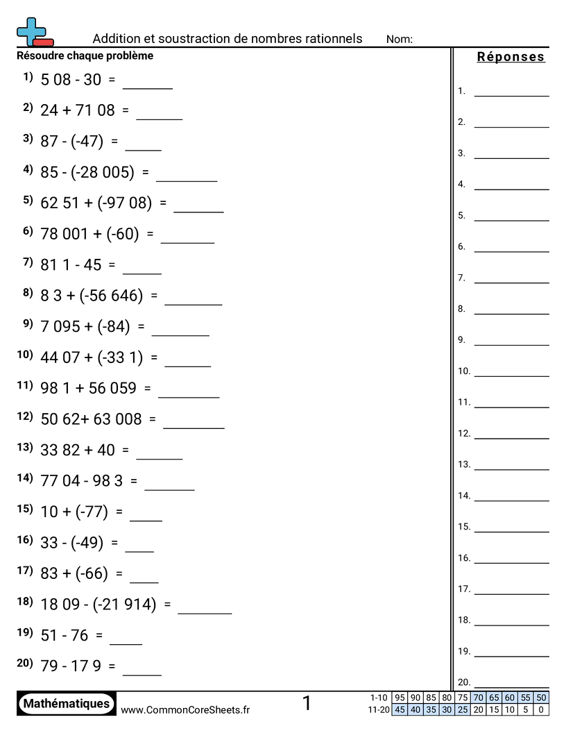 Fiches gratuites de math pour 5ème (7ns1d) sur Addition et soustraction de nombres rationnels. Chaque fiche contient 20 exercices avec corrigé et convient aux enseignants et à l'enseignement à domicile. Vous pouvez télécharger le PDF, créer des cartes mémoire ou l'utiliser pour l'apprentissage en ligne.