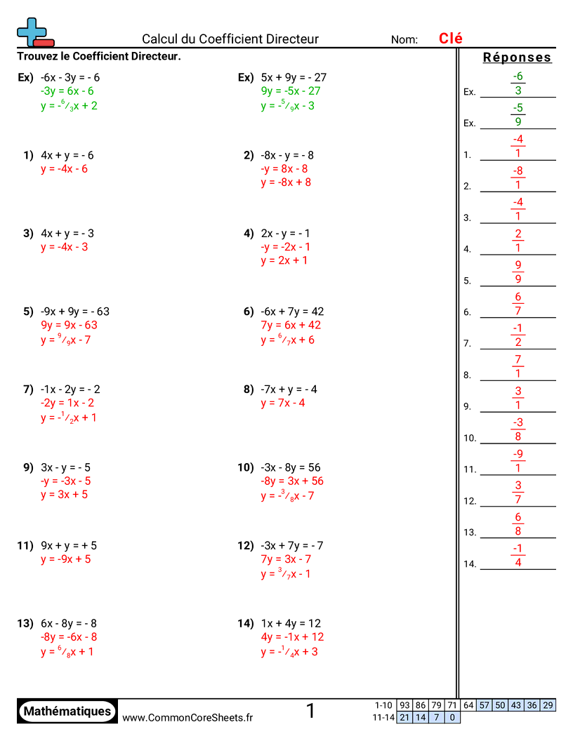 Chaque fiche comporte 14 exercices du calcul du coefficient directeur.