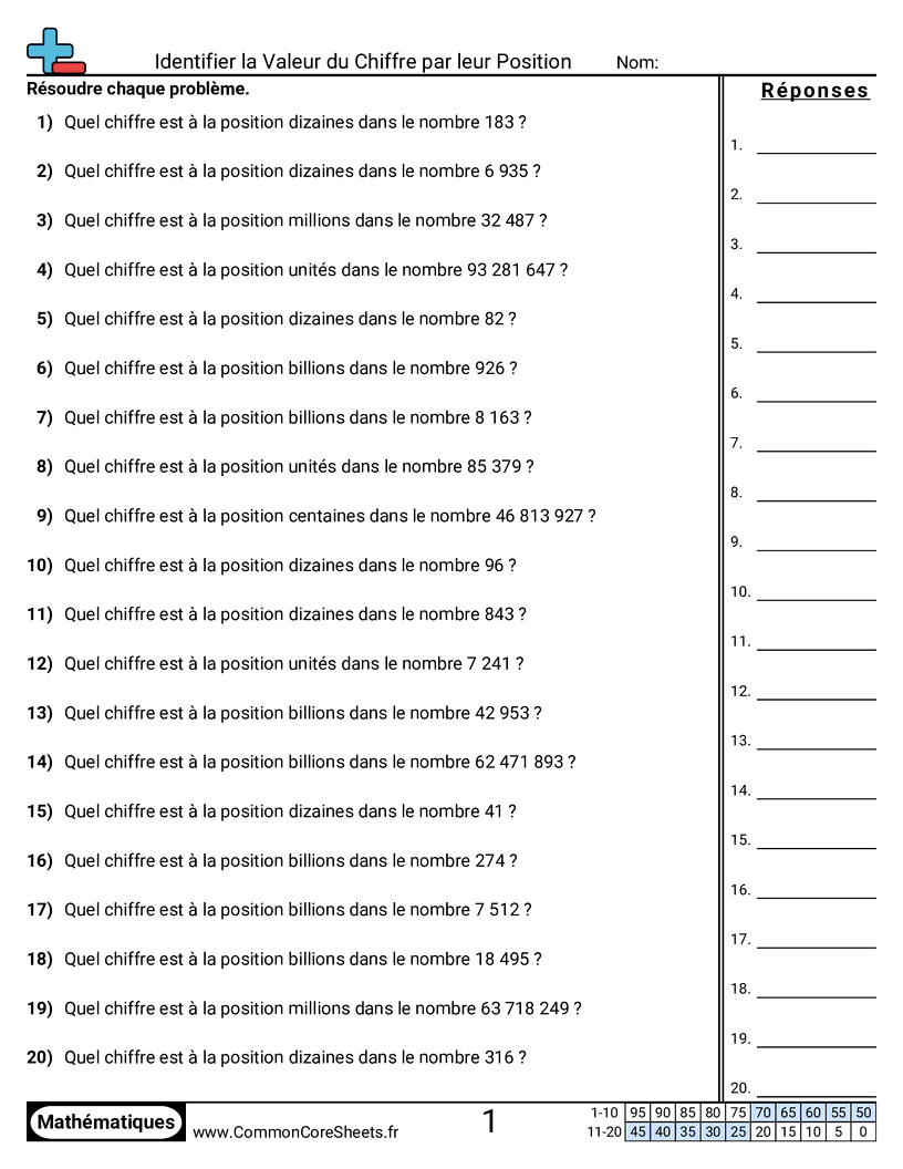 Fiches gratuites de math sur Identifier la Valeur du Chiffre par leur Position. Chaque fiche contient 20 exercices avec corrigé et convient aux enseignants et à l'enseignement à domicile. Vous pouvez télécharger le PDF, créer des cartes mémoire ou l'utiliser pour l'apprentissage en ligne.