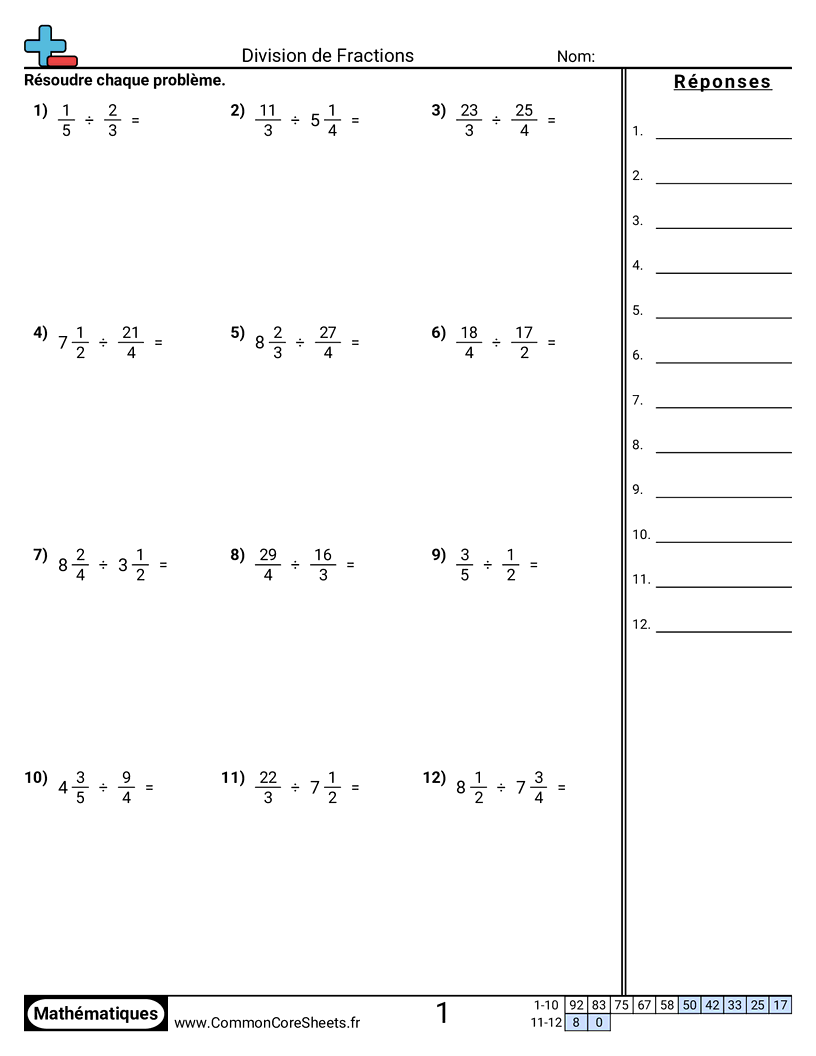 Fiches gratuites de math pour 6ème (6ns1) sur Division de Fractions. Chaque fiche contient 12 exercices avec corrigé et convient aux enseignants et à l'enseignement à domicile. Vous pouvez télécharger le PDF, créer des cartes mémoire ou l'utiliser pour l'apprentissage en ligne.