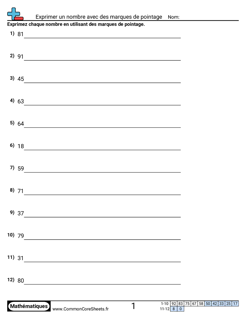 Fiches gratuites de math sur Exprimer un nombre avec des marques de pointage. Chaque fiche contient 12 exercices avec corrigé et convient aux enseignants et à l'enseignement à domicile. Vous pouvez télécharger le PDF, créer des cartes mémoire ou l'utiliser pour l'apprentissage en ligne.