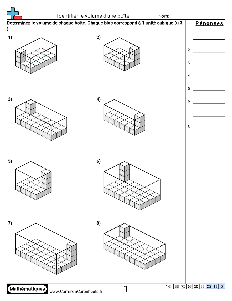 Fiches gratuites de math pour CM2 (5md3b) sur Identifier le volume d'une boîte. Chaque fiche contient 8 exercices avec corrigé et convient aux enseignants et à l'enseignement à domicile. Vous pouvez télécharger le PDF, créer des cartes mémoire ou l'utiliser pour l'apprentissage en ligne.